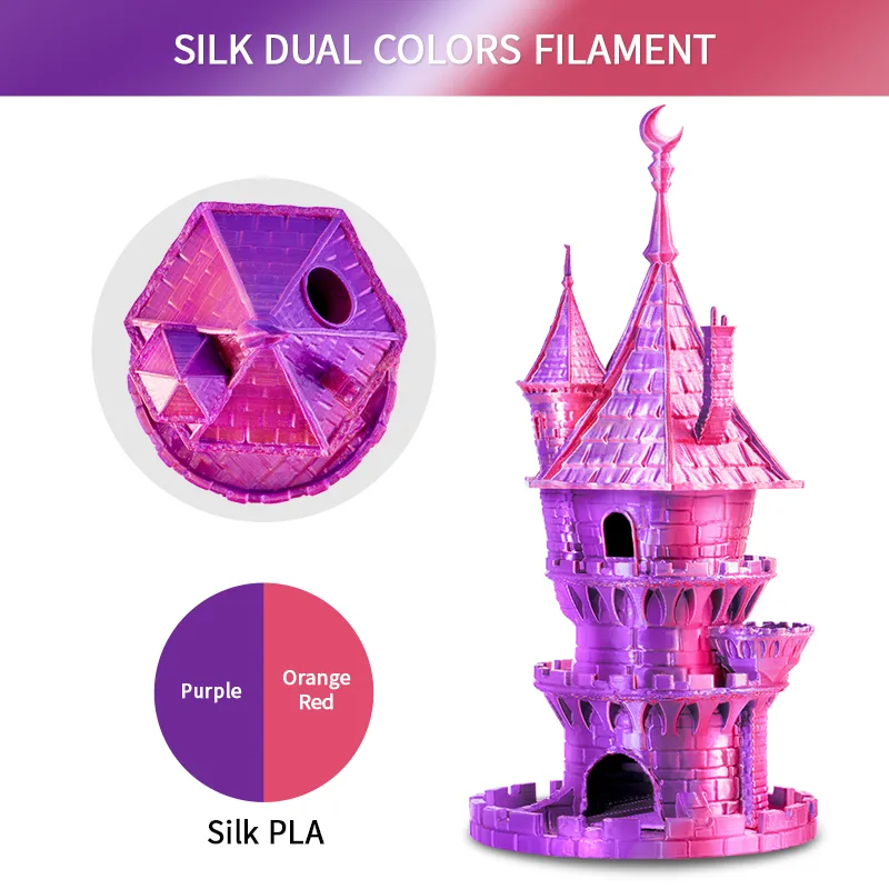 Dual Color Effect: The Orange Red & Purple Silk PLA filament combines two bold colors, seamlessly transitioning from rich orange-red to deep purple, creating a stunning, dynamic effect in your prints.