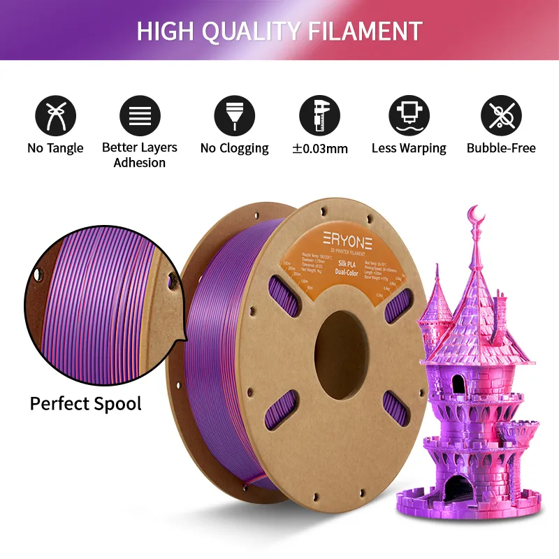 Bring vibrant, eye-catching colors to your 3D prints with the ERYONE Dual Color – Orange Red & Purple Silk PLA Filament. This premium filament blends the striking hues of orange-red and purple, creating a beautiful dynamic effect with a glossy silk finish. Perfect for artistic projects, jewelry, cosplay accessories, and prototypes, this filament offers smooth extrusion and high-quality results every time.
