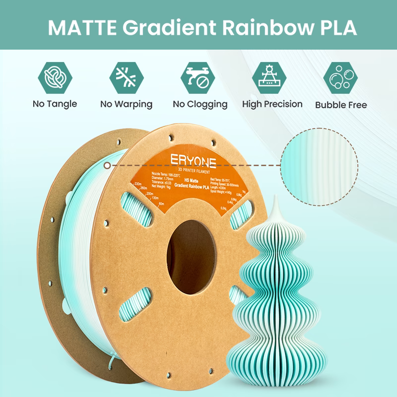 With ±0.03mm dimensional accuracy, clean spool winding, and consistent extrusion, ERYONE Hyper Speed Matte Gradient Rainbow PLA ensures flawless printing on Creality, Bambu Lab, Prusa, Anycubic, Elegoo, and almost every modern FDM printer.